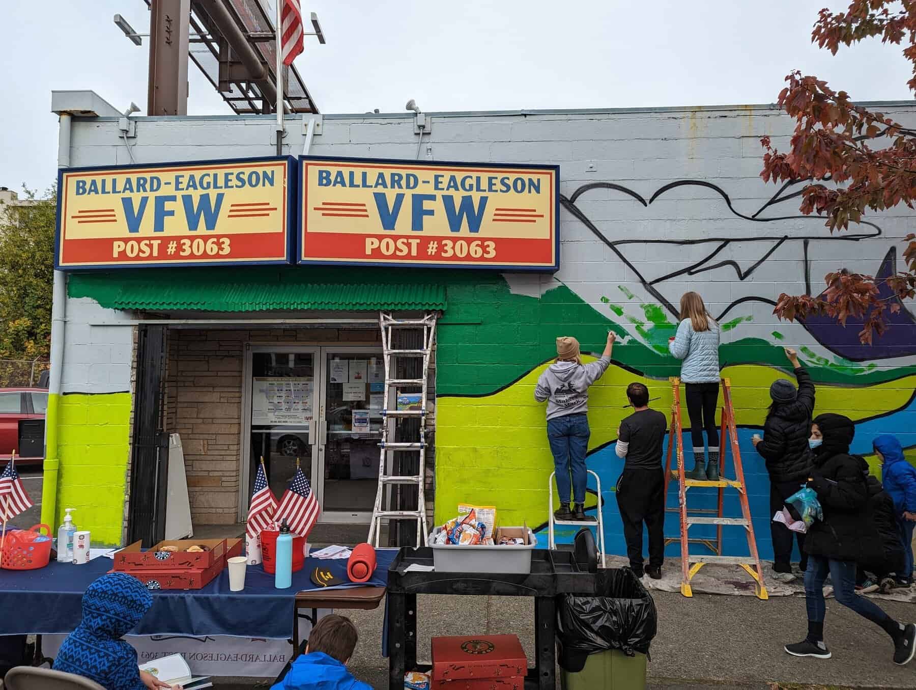 A group of volunteers helped paint a brand new mural for the side of the Ballard VFW.