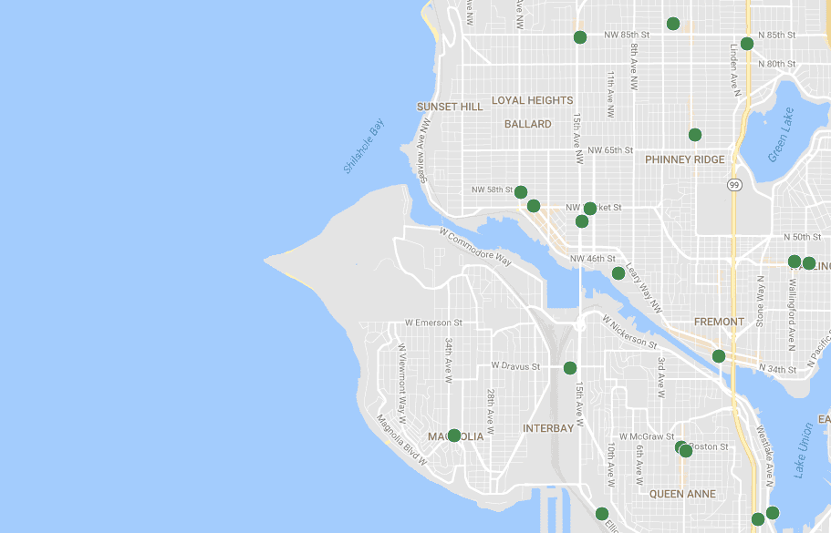 As you can see from the map above — that green dot in the middle of Interbay is the store that closed — Magnolia is down to one location. Central Ballard has 5 Starbucks (3 are inside other stores), and the newest location on 15th gets a heavy amount of drive-through traffic.