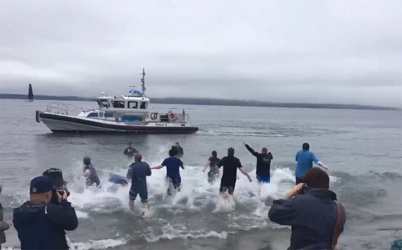 For extreme safety — and a better photo opportunity — a Seattle Police patrol boat was just off shore with divers in the water.