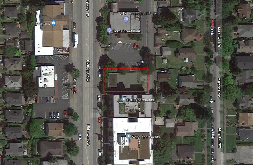 The site is bordered by Homestreet Bank to the north and Duo apartments to the south. The old Pancake House restaurant (soon to become Crown Hill Broiler) is across the street to the west. The only entrance to the camp will be on 15th Ave., not the alleyway behind it, which backs up to a residential area to the east.