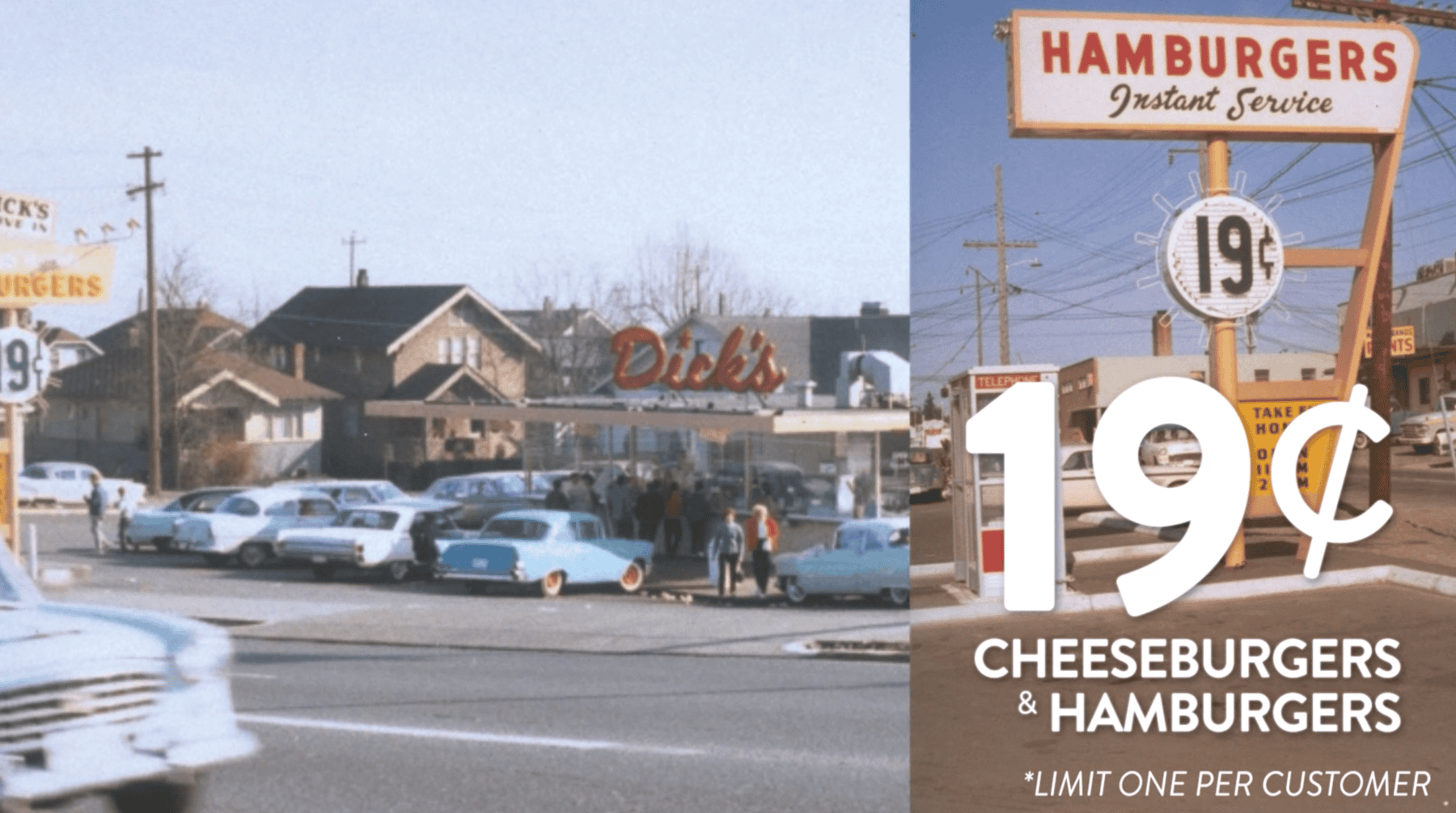 “We’re rolling back prices to 19¢ on our cheeseburgers and hamburgers,” Dick’s write on their event website. “Enjoy one of our classic burgers for the same price we offered in 1954 at all 7 Dick’s Drive-In locations.”