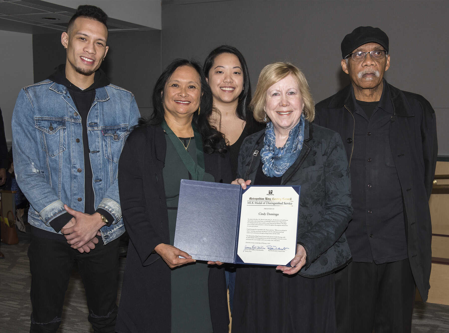 Photo: Metropolitan King County Councilmember Jeanne Kohl-Welles with Martin Luther King, Jr. Medal of Distinguished Service recipient Cindy Domingo and her family, courtesy King County Council