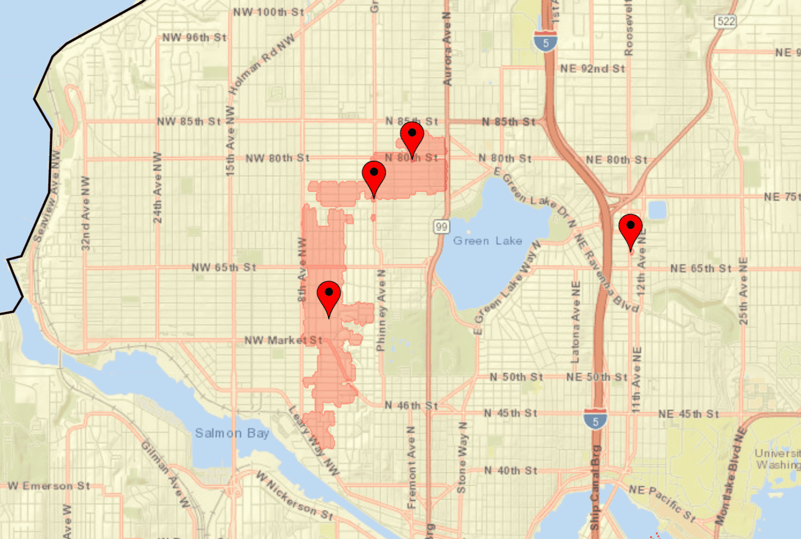 7:15 p.m.: Seattle Fire says a vehicle hit a power pole in the 5500 block of 4th Ave. NW – right next to Market St. at the base of the hill into Fremont – knocking wires down into the roadway.