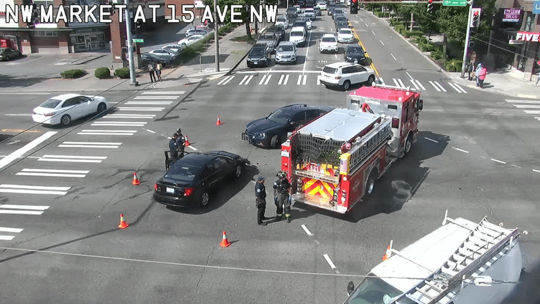 Updated 11:30 am: Seattle Fire responded for a two-car collision that has closed the intersection of 15th Ave. NW and NW Market St. Firefighters say two people sustained minor injuries and were able to extricated themselves from their vehicles. The roadway should be cleared shortly, and you can see our Ballard-area traffic cameras here.