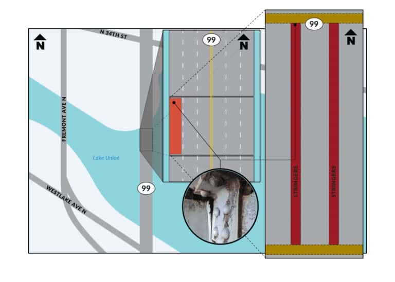 The damage was discovered on Sunday, during an in-depth inspection of the underside of the bridge. Washington State Department of Transportation (WSDOT) crews found advanced deterioration of steel on a support beam (also known as a stringer), adding pressure on the next beam, which is now carrying twice the weight it was designed for.