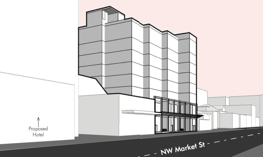The new land use application for 1740 NW Market St is for an 8-story apartment with 102 small efficiency dwelling units — the previous application was for 76 units. The building would have retail and office space, plus parking for two vehicles.