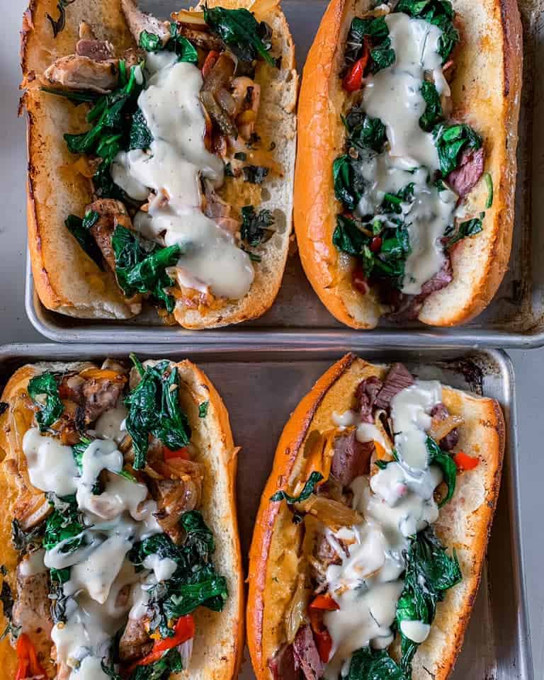 The oven-baked sandwiches are served on toasted baguettes with fillings that include a choice of fennel roasted pork, pickled vegetables, and parmesan fonduta; or wood grilled eggplant, pickled green tomatoes and peppers with parmesan fonduta.