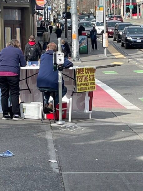 Seattle and King County Public Health say there have been a number of COVID testing operations popping up lately, often in the form of walk-up testing tables. One of these tables was recently spotted in Ballard on NW Market St.