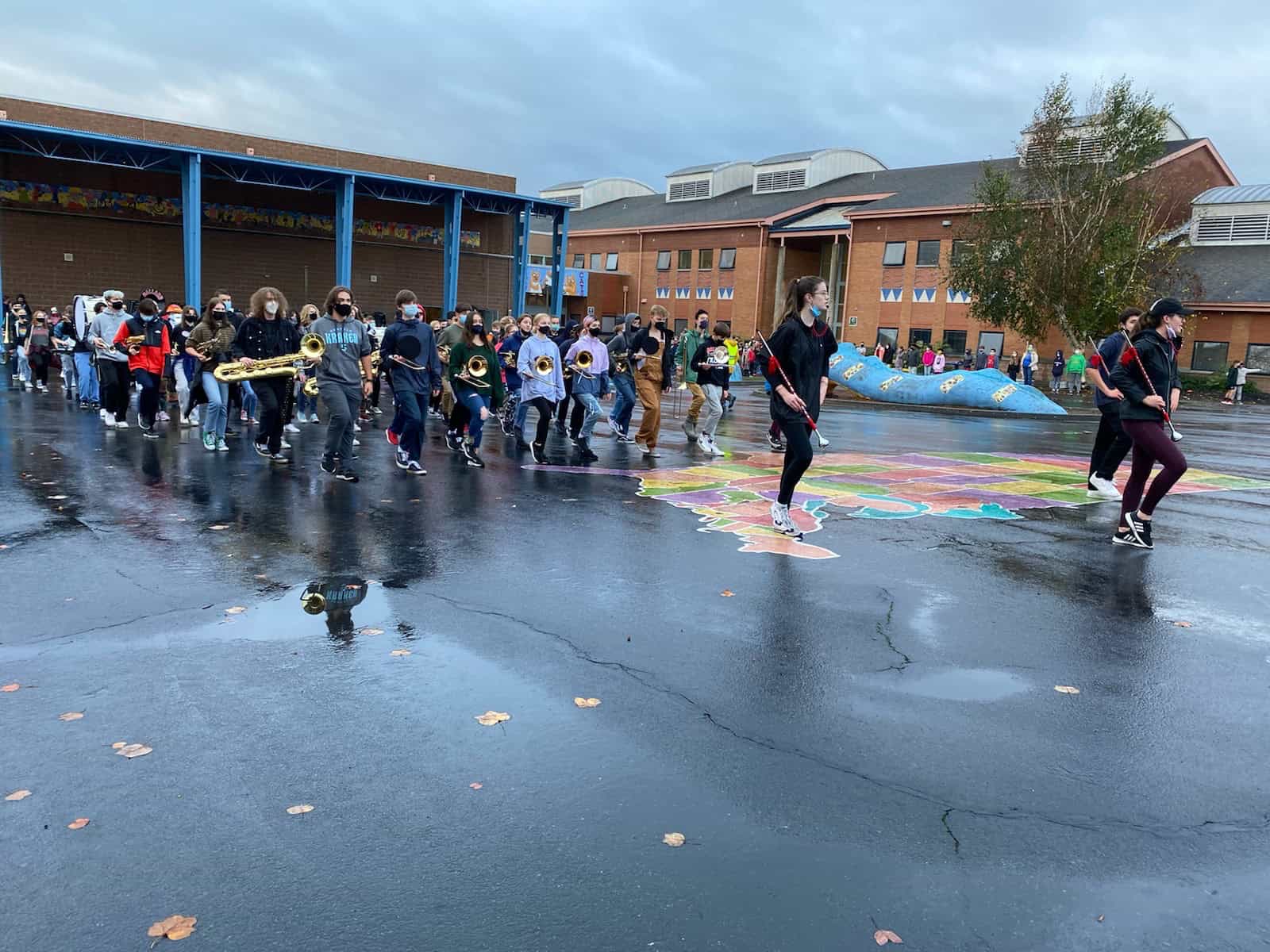 The students are marching through the neighborhood to practice for their Veterans Day Parade appearance in Auburn; this will be the second time they parade through nearby streets to practice.