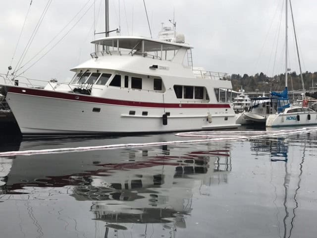 The spill happened during a fuel transfer that overfilled a tank and spilled from a vent on a 65-foot recreational boat. The Washington Department of Ecology responded to the spill with an absorbent boom, helping to capture much of the sheen.