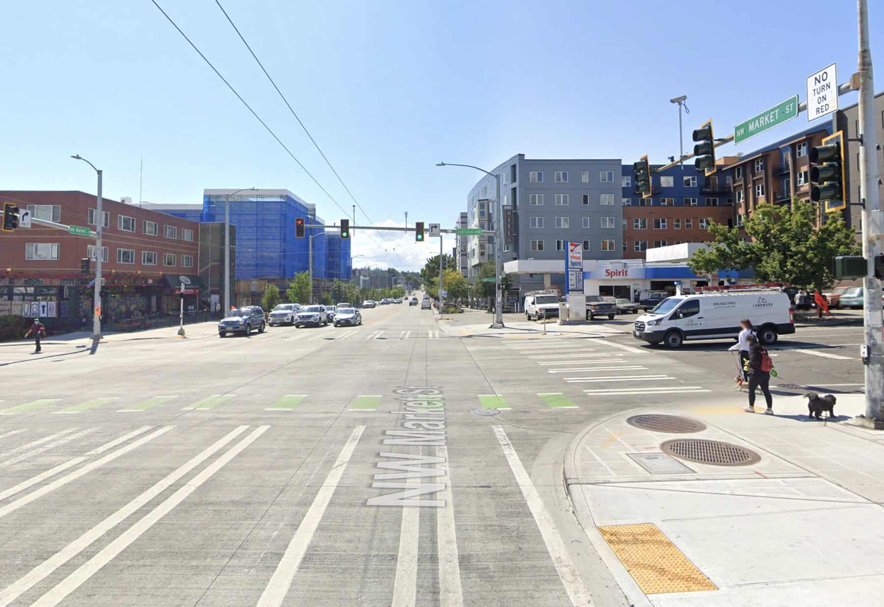 A Ballard resident was injured and his dog killed when they were struck by a vehicle while crossing in a crosswalk at 24th Ave NW and NW Market St over the weekend.