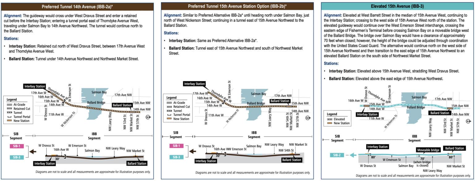 There are two different Ballard Station locations being discussed; one is on 14th Ave NW, and the other on 15th Ave NW. In the diagrams below, pink is used for preferred alternatives, brown is for preferred alternatives with third-party funding, and blue is for other alternatives.