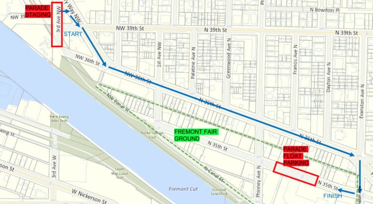 This year, the parade will begin at 2 p.m. on Leary Way NW near the cross-street of NW 39th St. It will travel eastbound on Leary Way, connecting with NW 36th St before heading eastbound on N 36th St for a half-mile before turning right onto Evanston Ave N. After one block, the parade will turn right again on N 35th St where the route will finish in the heart of the Fremont Fair, rather than at Gas Works Park as it has in previous years.