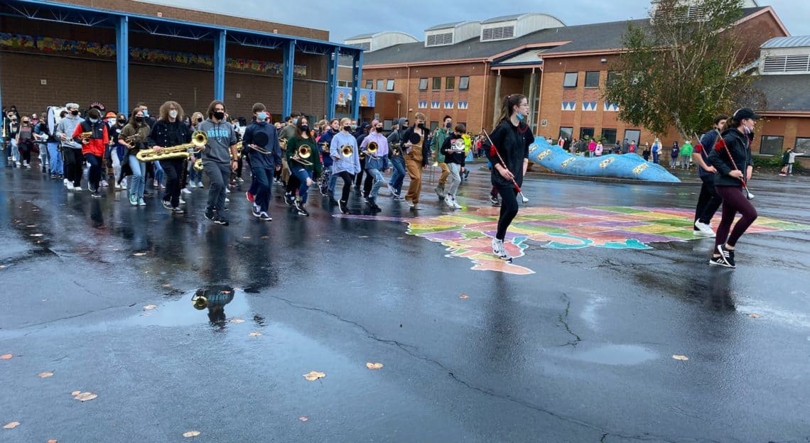 The exact route is unavailable, but you may see them as they parade around the neighborhood surrounding the high school.