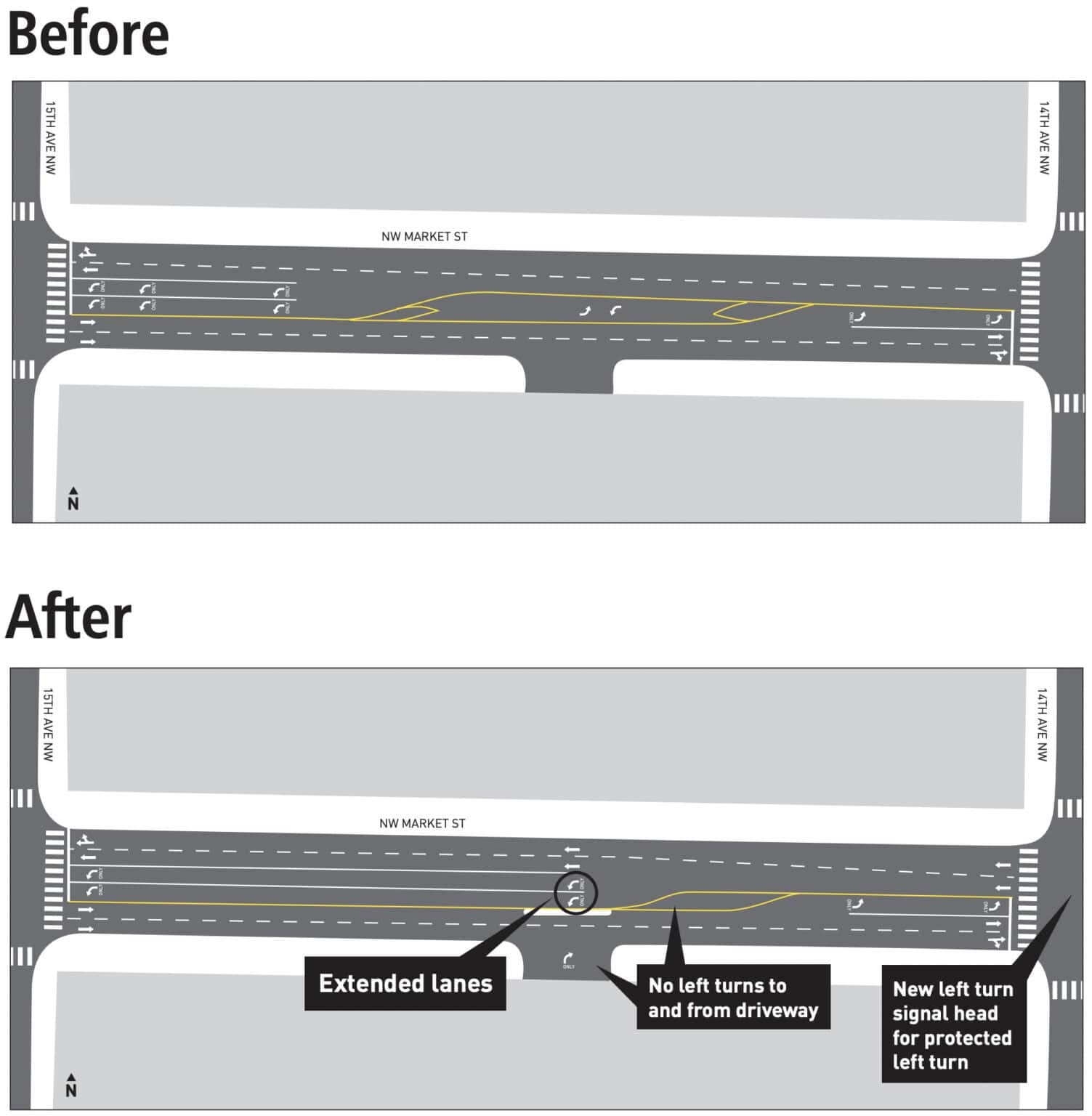 Another significant change is the new left turn signal head for a protected left turn for southbound left-turning drivers on 14th Ave NW at Market.
