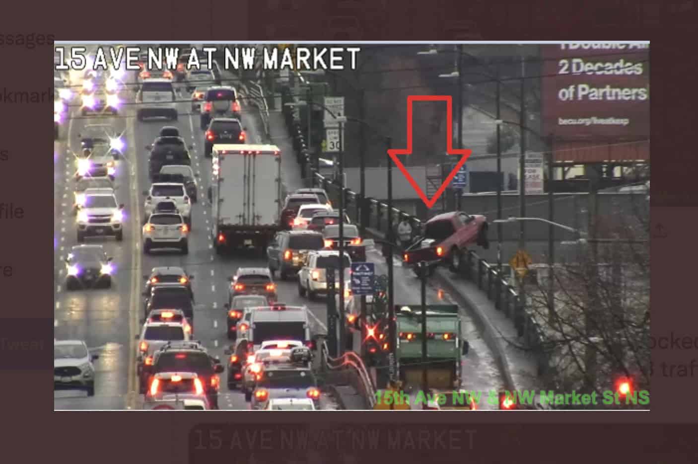 The Ballard Bridge was partially closed for about an hour during Tuesday’s afternoon commute due to a pickup truck dangling precariously over the edge of the bridge.