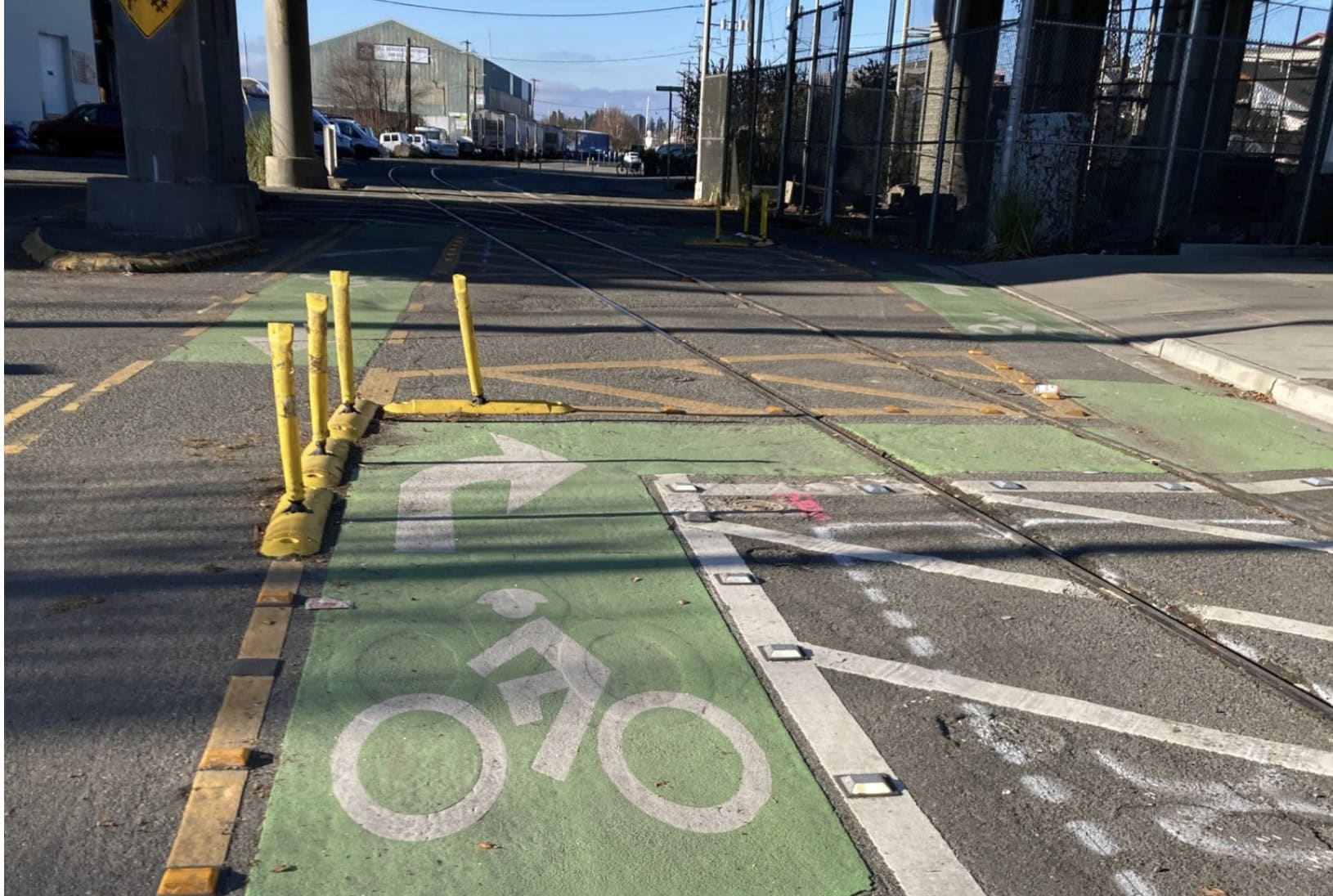 Next year, SDOT plans to realign the bike lanes south of the bridge support columns. “This will be a more comfortable and intuitive layout for people riding bikes, guiding them to cross the train tracks at a safe angle,” SDOT says.
