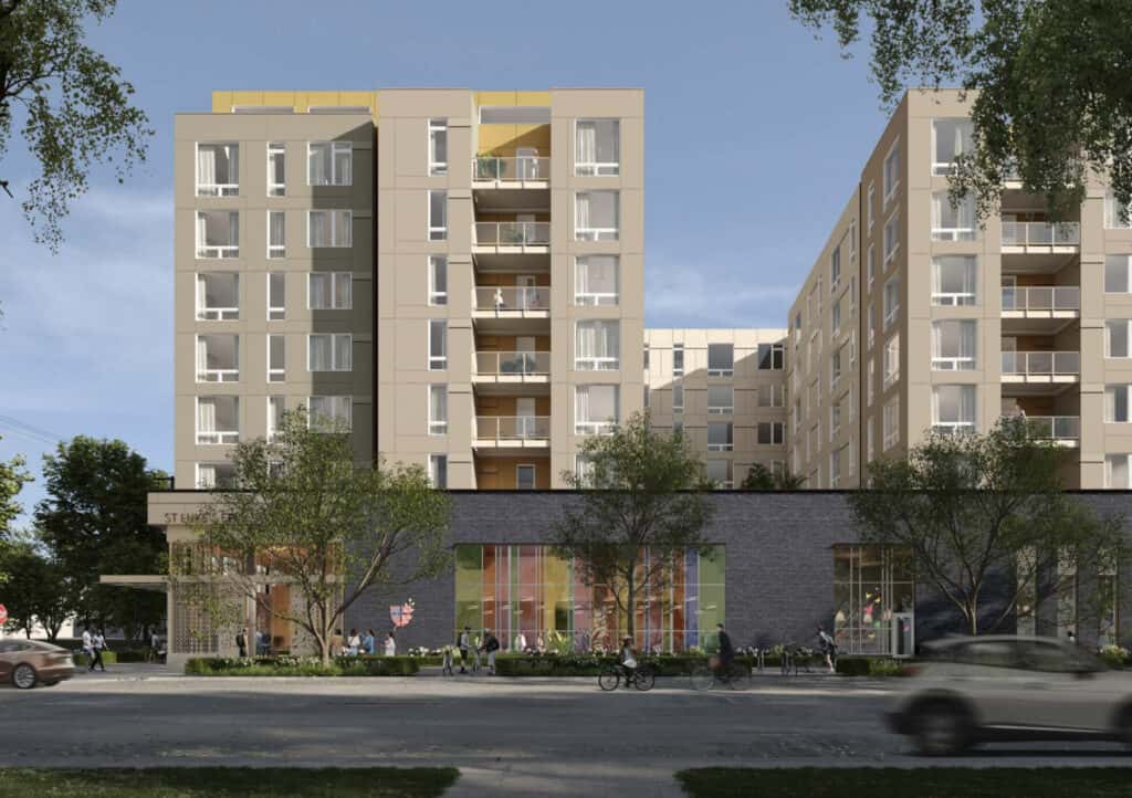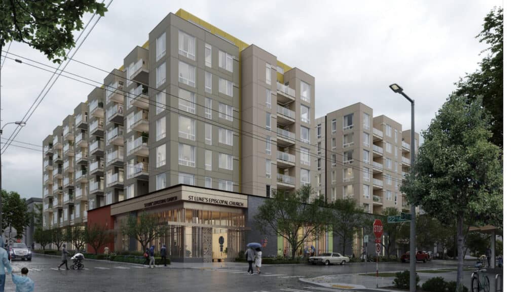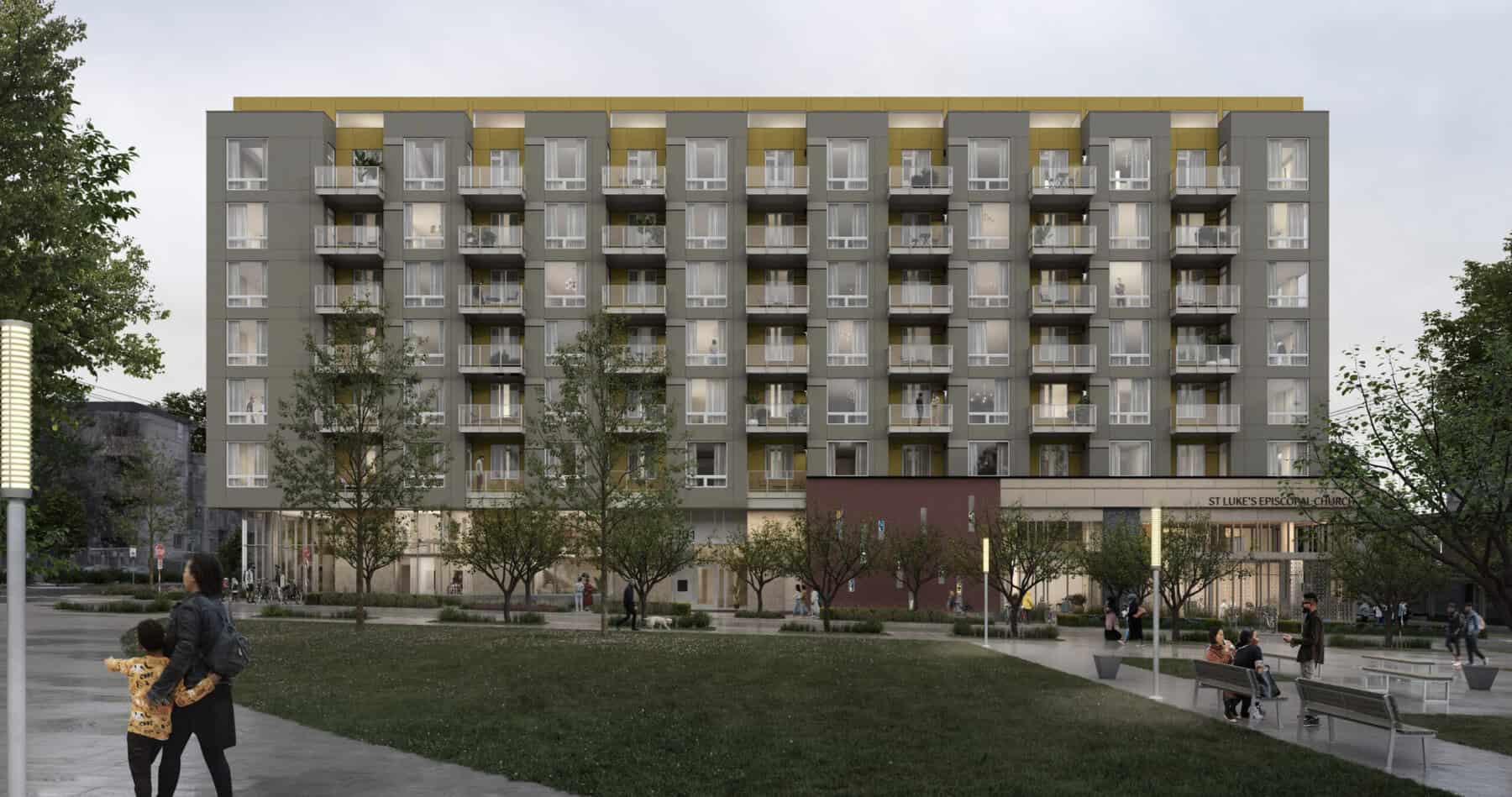 The project—a joint partnership with Heartland LLC, Bridge Housing, and Security Properties—will include two buildings: One with affordable housing units and the other with market-rate apartment homes. The two buildings will be integrated but separate, along with a new worship space for St. Luke’s congregation.