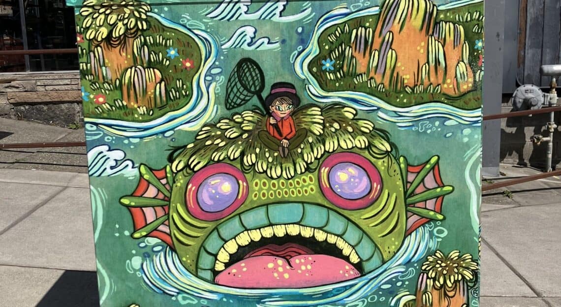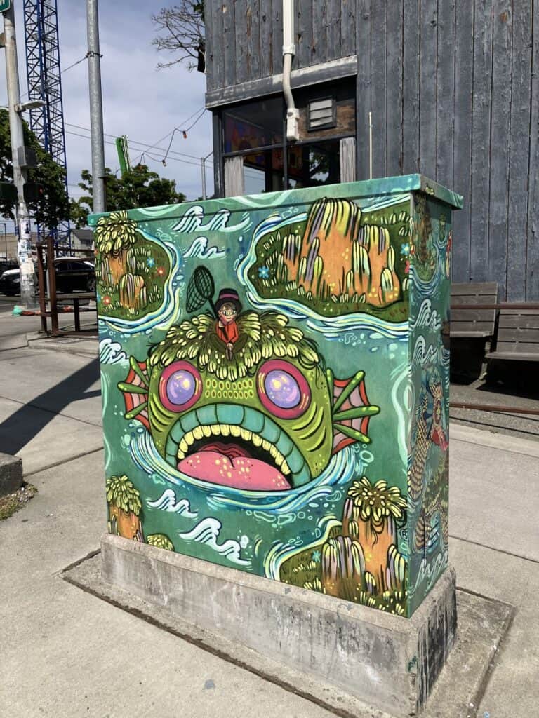 Local artist Rhodora Jacob designed the box, which the Alliance says “weaves Ballard’s heritage and natural surroundings together, creating a captivating piece of public art that will transport you to a world where magic and reality harmoniously dance!”