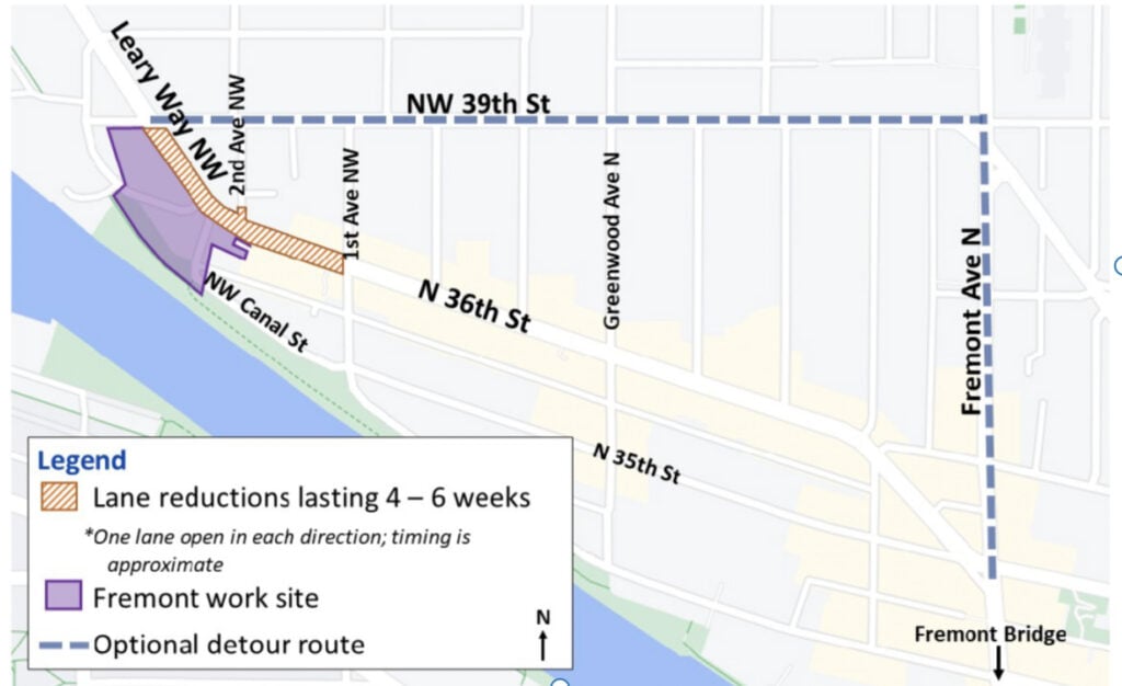 Starting Monday, August 14, crews will close the two southern lanes on Leary Way NW between NW 39th St and 1st Ave NW. They’ll shift traffic to the northernmost lanes to maintain one traffic lane in each direction. The configuration will be in place 24 hours daily for four to six weeks.