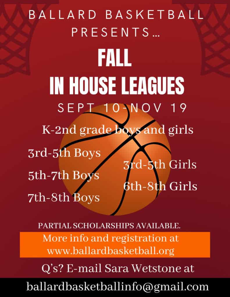 Led by Coach Sara Wetstone, Ballard Basketball’s fall in-house league starts Sept. 10 and lasts through Nov. 19.