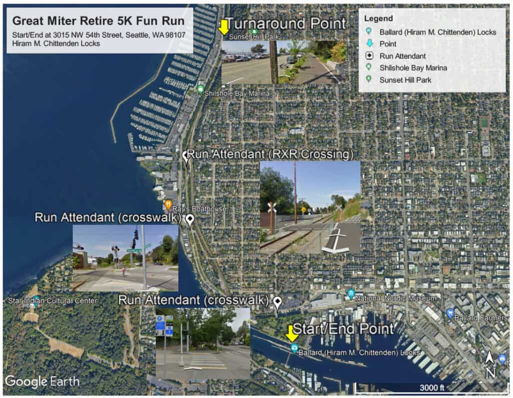 The fun run will start and end at the miter gates. The 5k will take runners from the Ballard Locks at 3015 NW 54th St along the Burke-Gilman Trail towards Golden Gardens to the turnaround point (see below).