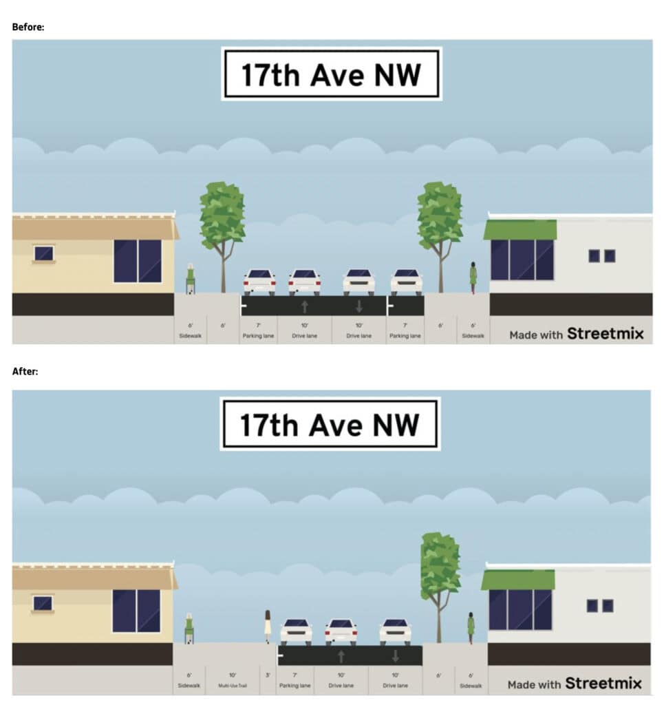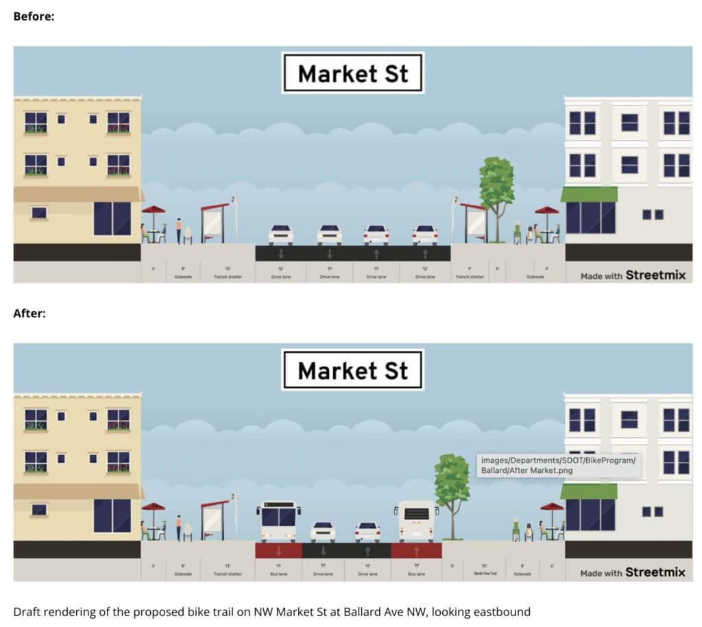SDOT is proposing a 10-foot-wide, .6-mile trail for the south side of Market, the west side of Leary, and the west side of 17th. Here are the changes for each section of the trail: