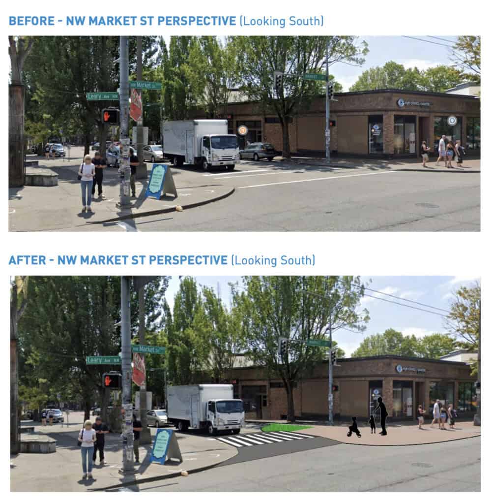 SDOT’s proposal also redesigns the eastbound bus stop for Route 40 and Route 44 with a 10-foot-wide pedestrian loading area closer to 22nd Ave NW. The design also calls for a 5-foot-wide planting strip for new street trees.