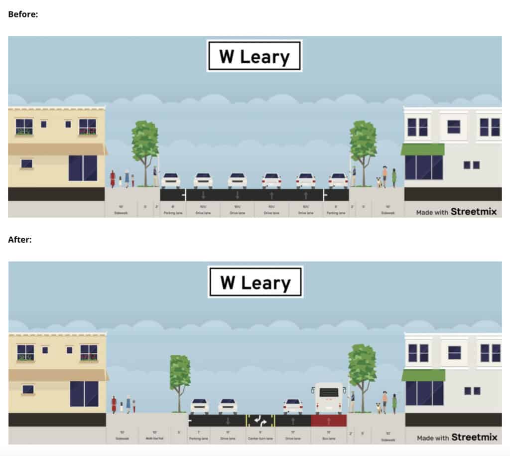 On Leary, SDOT plans to eliminate two driving lanes, turning one into a center turn lane and the other into a bus-only lane.