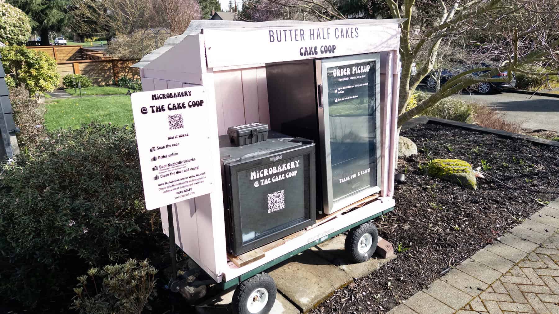 Baker and owner of Butter Half Cakes Nicole Conley is at the helm of the walk-up microbakery at 8039 30th Ave NW. Think of it like a cake vending machine: You walk up, scan a code, select your treat, and the fridge will open up for you to take your goodies.
