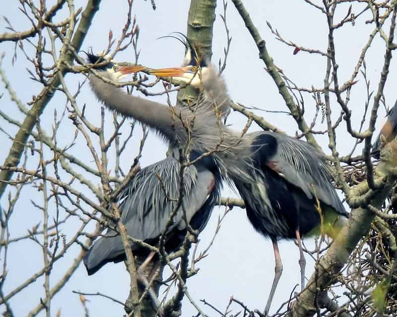 “The male gathers branches and sticks from nearby trees—sometimes stealing sticks from other nests, and the female decides if the stick is worthy. If so, she’ll carefully create or bolster the nest. Most herons have chosen their mate for the season, and a few couples are already incubating eggs!”