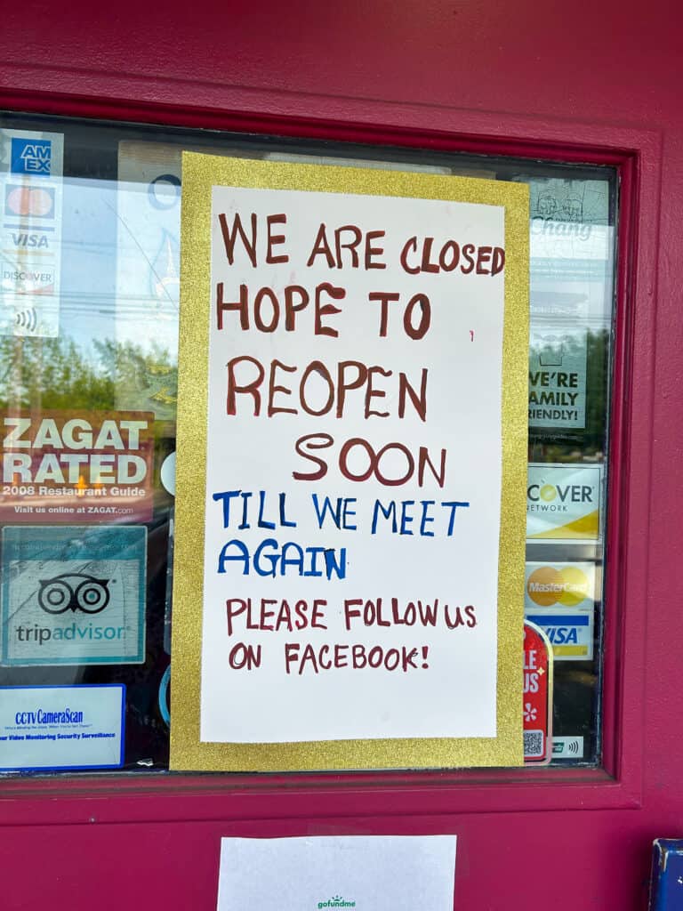 “WE ARE CLOSED; HOPE TO REOPEN SOON; TILL WE MEET AGAIN; PLEASE FOLLOW US ON FACEBOOK!”