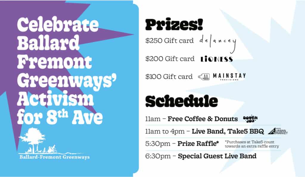 Organizers say the event is a chance to thank the community for its role in both the reopening of Take5 and the successful push for pedestrian safety improvements along 8th Avenue NW. Earlier this year, the Seattle Department of Transportation announced plans to add three new pedestrian crossings at NW 51st, NW 53rd, and NW 70th streets.