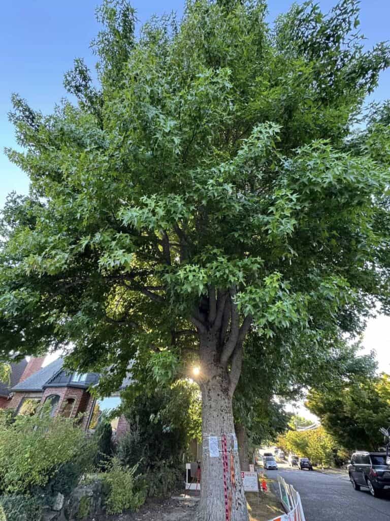 It’s not without irony, our sweet gum, you with your star-shaped leaves, green in summer, then yellow, then organe, into red, and finally turning purple, close to Christmas, that it’s your roots that have become your undoing.