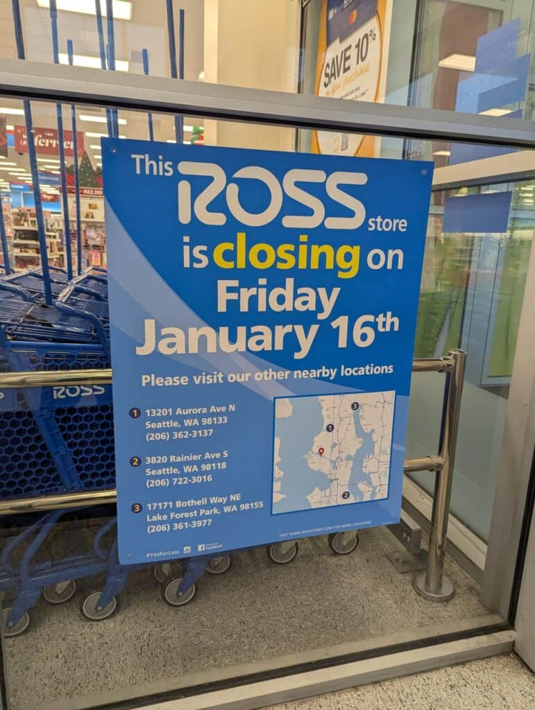 A store employee confirmed the closing date by phone, and the downtown Ross is also closing on January 16, as The Seattle Times reported.