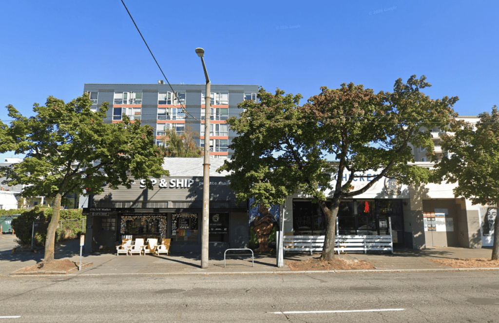 The project site includes the former Ballard Blossom building and neighboring properties, where several businesses have recently closed or relocated due to the planned redevelopment. Sip & Ship closed in December after 23 years in Ballard, with the business citing the upcoming redevelopment of the site. Sip & Ship still operates its Greenwood location at 7511 Greenwood Ave N.