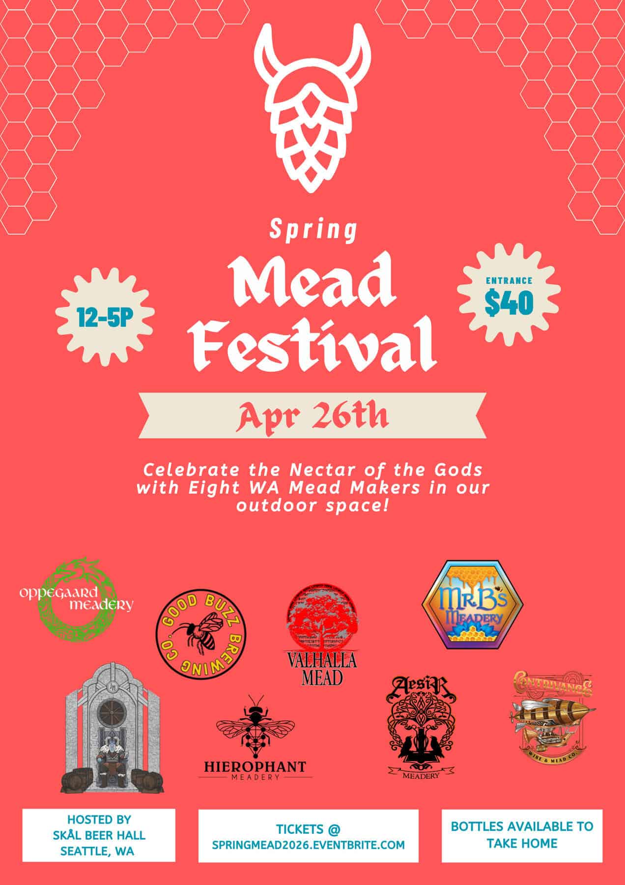 SKÅL Beer Hall 5429 Ballard Ave NW, Seattle, WA, United StatesCelebrate the Nectar of the Gods with WA Mead Makers! Eight local meaderies will be on hand to pour their Spring favorites in our covered outdoor street cafe. Come mead the makers, sample a variety of meads, and take home a bottle or two.