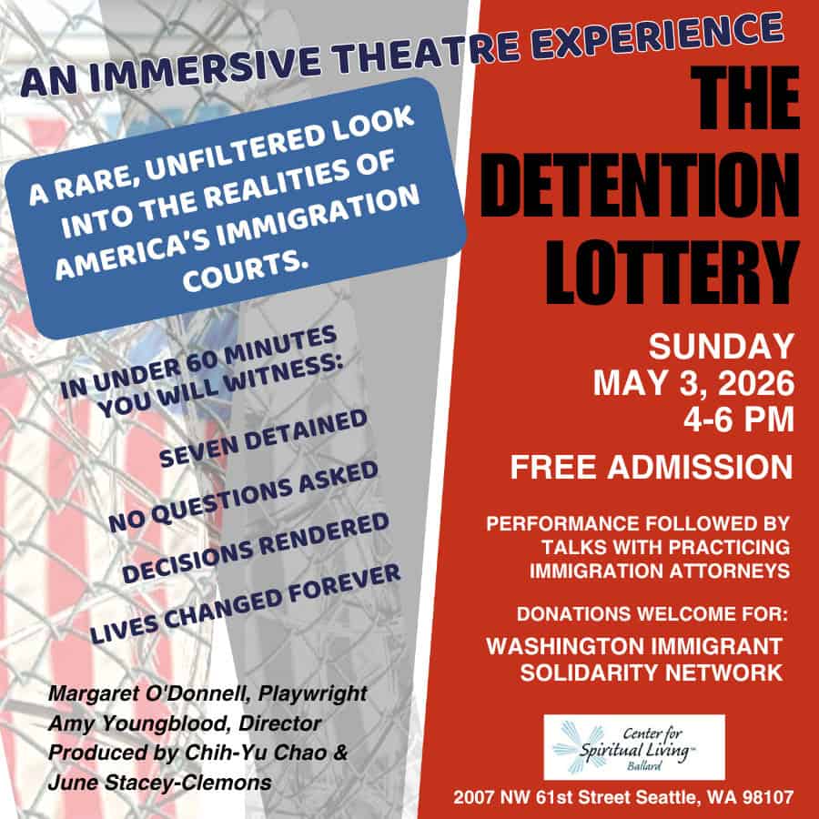 Center for Spiritual Living Ballard 2007 NW 61st St, Seattle, WA, United StatesTHE DETENTION LOTTERY is an immersive theatre experience. You will witness the portrayal of the stark reality of America's broken immigration court system. SEVEN DETAINED. NO QUESTIONS ANSWERED. DECISIONS RENDERED. LIVES CHANGED FOREVER. You'll experience the tension, chaos, and urgency that define these court proceedings. Practicing immigration attorneys play key roles in real-life scenarios. Detainees ...