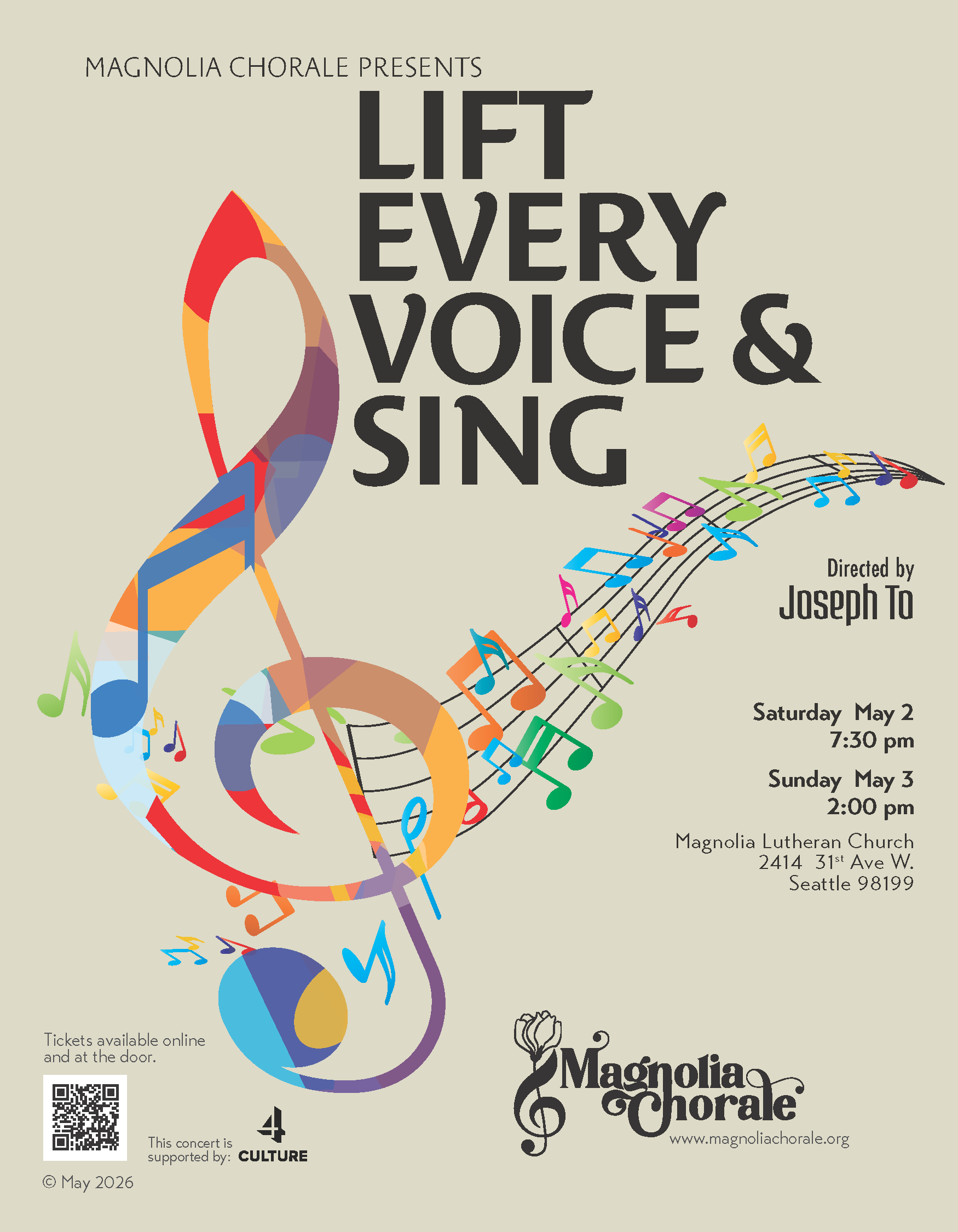 Magnolia Lutheran Church 2414 31st Avenue West, Seattle, WA, United StatesMagnolia Chorale, led by Artistic Director Joseph To, presents spring concerts themed “Lift Every Voice and Sing,” after the historic African-American anthem written in 1900 by James Weldon Johnson (lyrics) and his brother Rosamond (music). Inspired by this year's 250th anniversary of the signing of the Declaration of Independence, the program presents a multicultural perspective ...